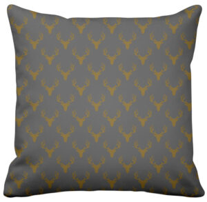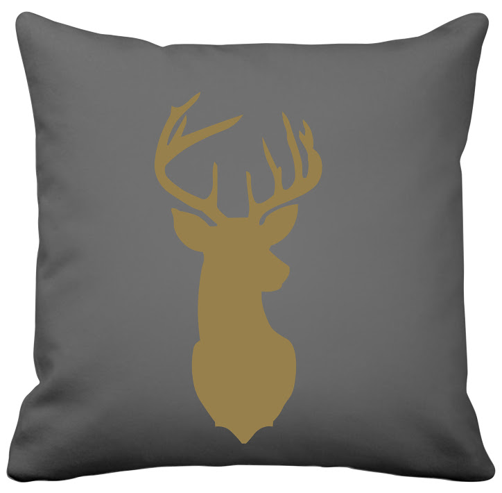 Koksgrå baggrund til det gyldne hjortehoved, der står flot og grafisk på dette pudebetræk. Flot at mikse med andre fra samme serier med grå og gyldne farver. Måler 50X50cm.
