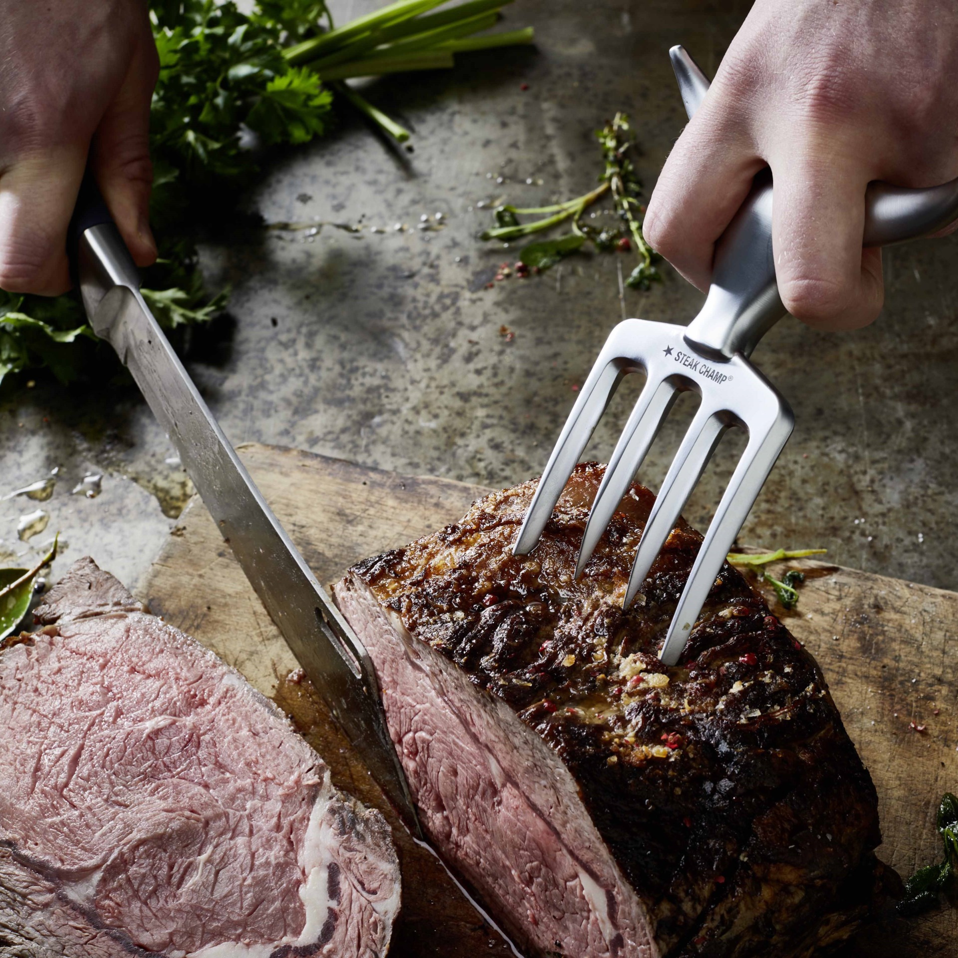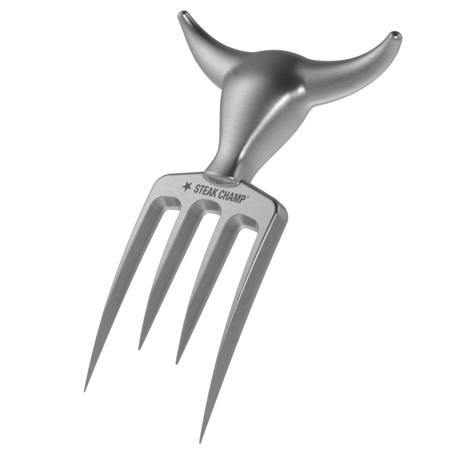 Den flot designede Bull Fork stegegaffel fra tyske SteakChamp er både effektiv og nyttig. Den tunge gaffel, med grebet formet som et tyrehoved, ligger godt i hånden, og de skarpe tænder hjælper til at holde fast på de store kødstykker.