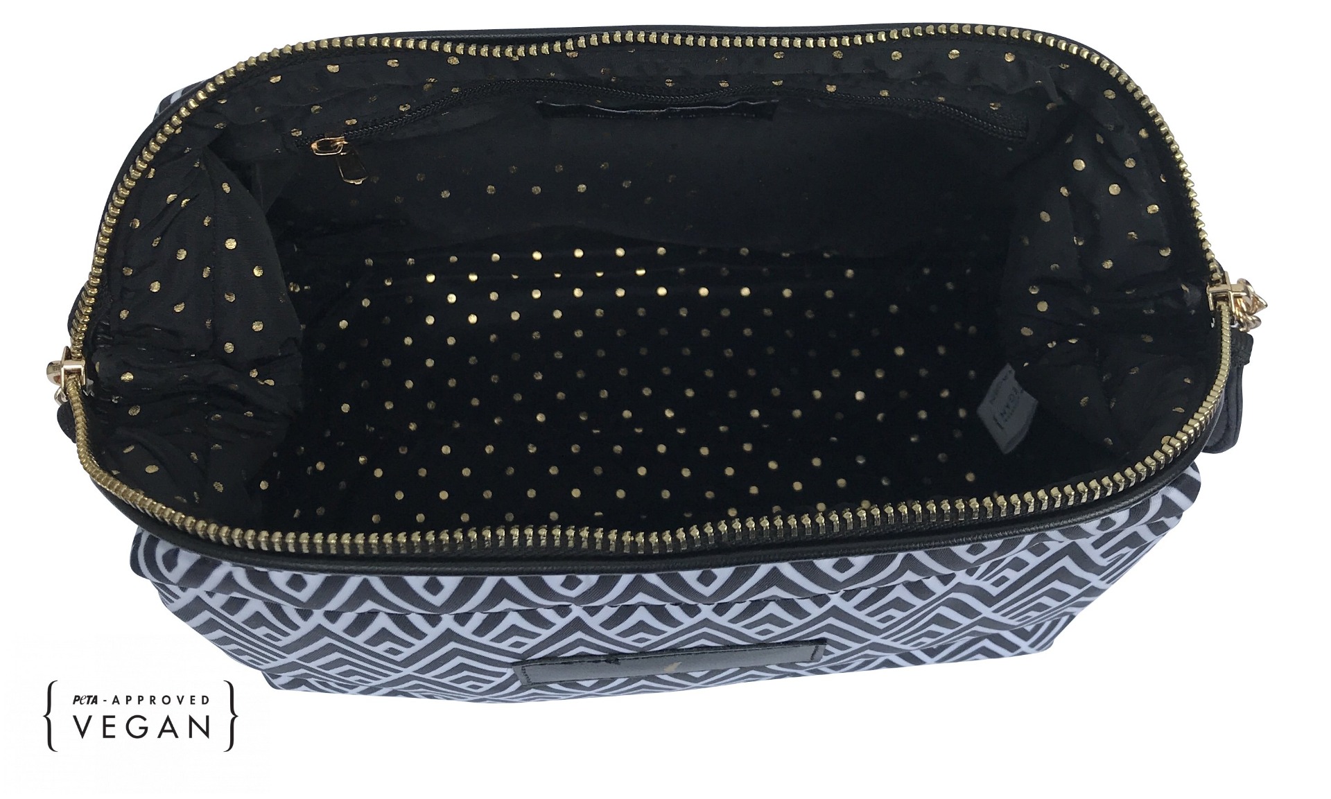 I kraftig blød nylon med guldprikket for, og som en genial detalje har tasken en metalbøjle foroven der gør, at den kan stå åben, mens man bruger den, så man kan se hele indholdet.