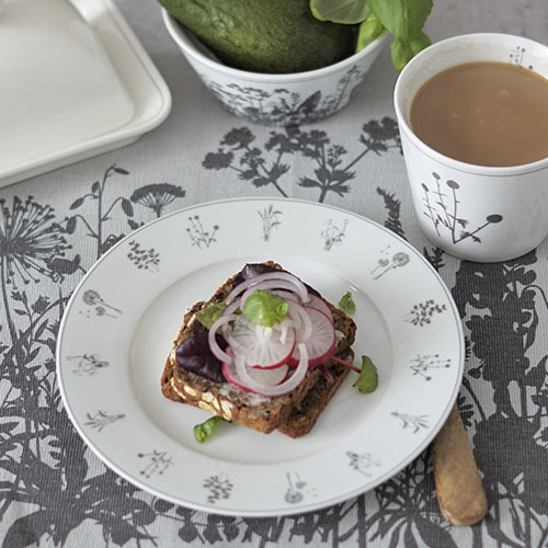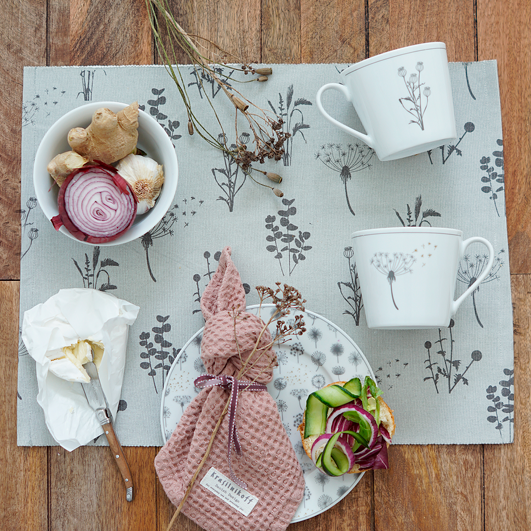 Designet med det stilrene og samtidig hyggelige blomstermotiv skaber nemt en god og hyggelig stemning ved bordet. Match med kopper, dækkeservietter og tallerken eller miks med andre designs i Happy.. serien.