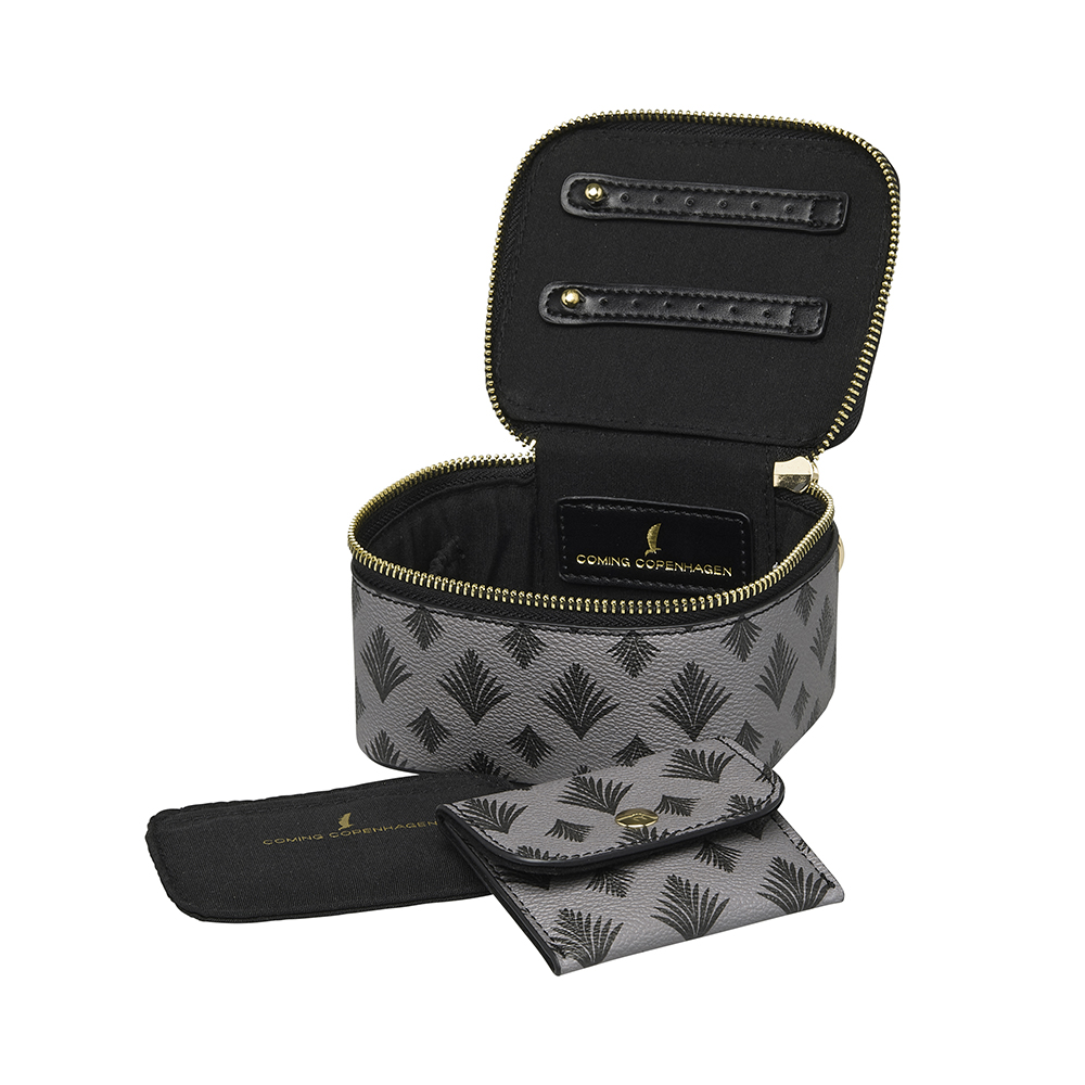 Paloma smykkeskrin er fremstillet i den lækreste kvalitet af 100% PETA certificerede veganske materialer. Med bundfarven i mole / muldvarpegrå, sorte detaljer og sort for, er den elegant og tidsløs – men med et moderne look, der kendetegner Coming Copenhagens stilsikre produkter.