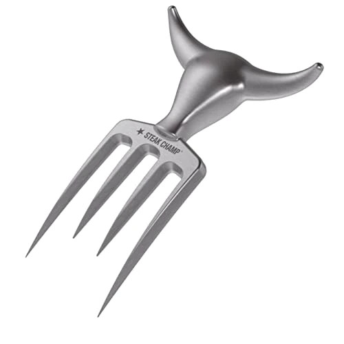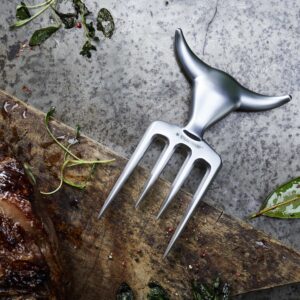 Bull Fork kødgaflen er blevet SteakChamps signaturprodukt. Den kraftige kødgaffel er et rigtigt “mande-værktøj”, når menuen står på grillmad derhjemme. Den tunge gaffel med solidt greb hjælper, når kødstykkerne skal trancheres i køkkenet eller ved bordet. Perfekt redskab også når kød skal flås fra hinanden til pulled pork. Gaflen er fremstillet med zinklegering og mat forkromet, så den ikke ruster. Måler 16,5CM.